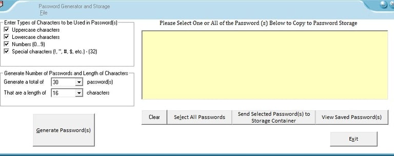 Use the password generator feature to create strong, randomized passwords instantly. Passwords may also be stored.